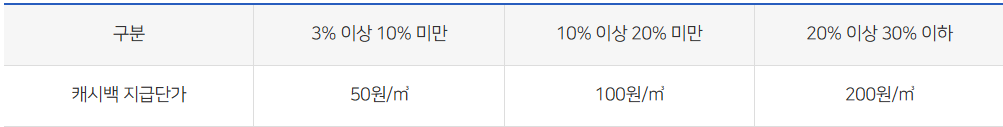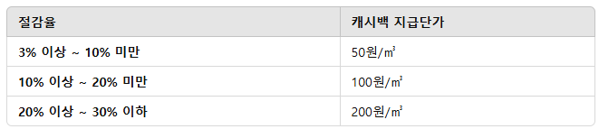 전년도 같은 기간 대비 사용량을 3% 이상 절감하면 절감량에 따라 차등적으로 캐시백을 지급하는 방식입니다.
