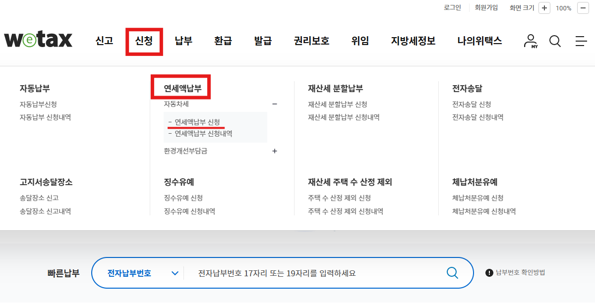 2️⃣ 로그인 후 "자동차세 연납 신청" 메뉴 클릭